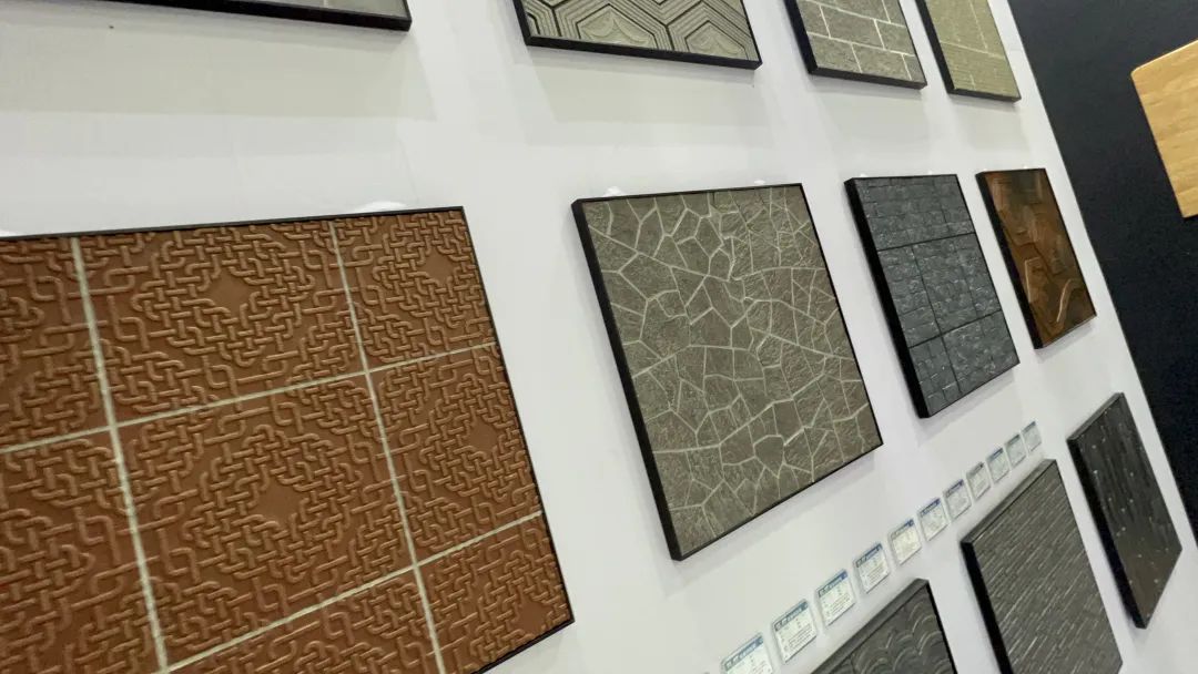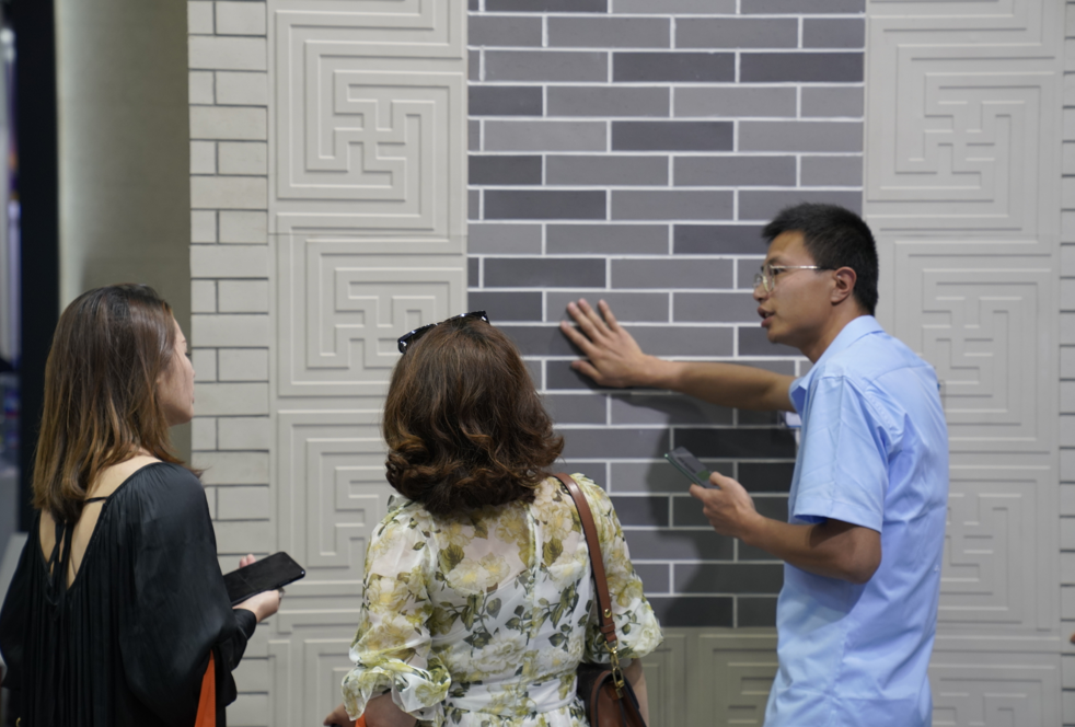 福萊特軟瓷展位,波浪形狀的展位上貼滿了各種風格的“磚”,吸引了建筑裝飾人的駐足關注。